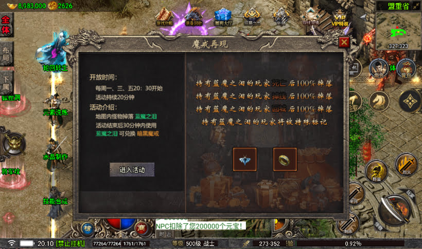 版本里面增加了很多非常主流的自定义对话框,比如福利大厅、坐骑、转生等等,在短暂的测试过程中,帮主把里面看到的NPC都测试了一下,因为是团购过来的版本,没有发现明显的问题,总的来说,版本看着高端大气可玩性强,前提是Gm或者玩家喜欢这类的版本,不喜欢是感觉不到这些方面,但很多功能确实是仿制大服1:1制作出来的。其他的细节喜欢这类版本的兄弟自行搭建测试。